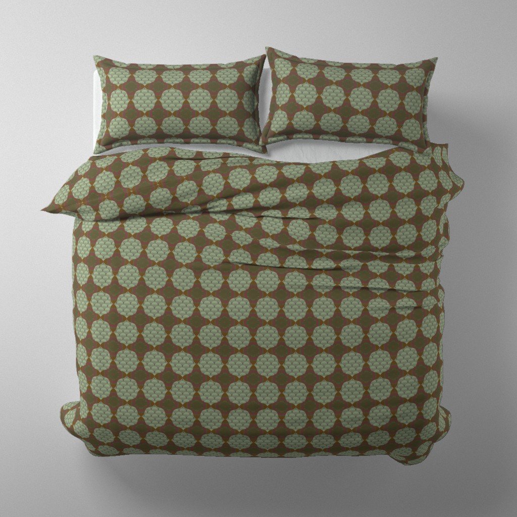 Classic fish scale and center star design in four colors: Grey Green, Jade Green, Dark Brown, and Gold Bronze - each shown mocked up in a selection of applications.